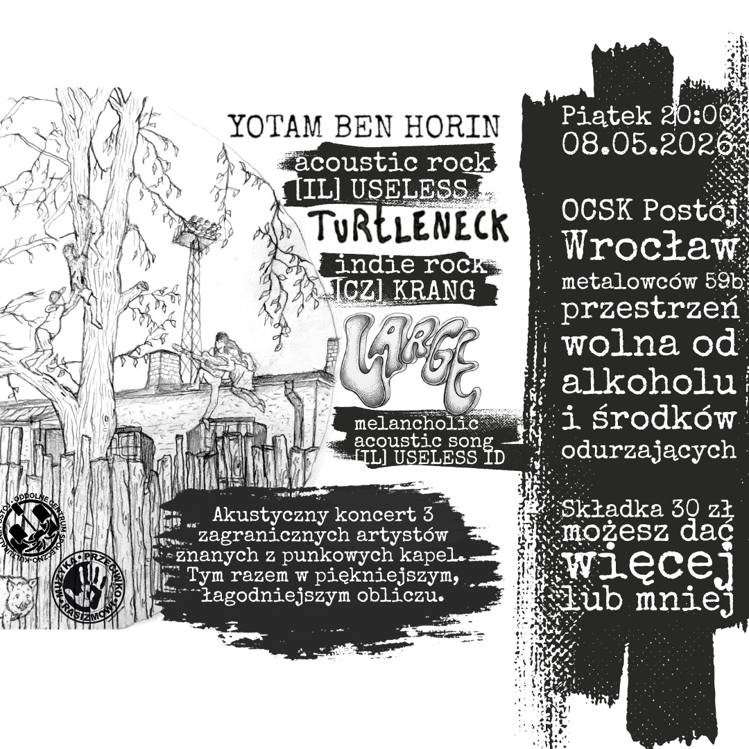 Yotam Ben Horin - Znany jako wokalista i główny autor tekstów legendarnego punkowego zespołu Useless ID z Haiffy. W 2015 roku Yotam postanowił porzucić wszystko i rozpocząć życie w trasie. Od tego czasu nieustannie podróżuje, doświadczając życia w zupełnie nowy sposób. Ten nieustanny ruch wyniósł jego umiejętności kompozytorskie na nowe wyżyny i zaowocował pięcioma solowymi albumami i najnowszym najbardziej osobistym albumem „Reflections Of You”, wydanym we własnej wytwórni California Sounds, którą prowadzi wraz ze swoją partnerką, Paolą Cash. „Reflections Of You*” zawiera jedne z jego najbardziej intymnych i osobistych utworów i to głównie z nimi nas odwiedzi. https://www.instagram.com/yotambenhorin/