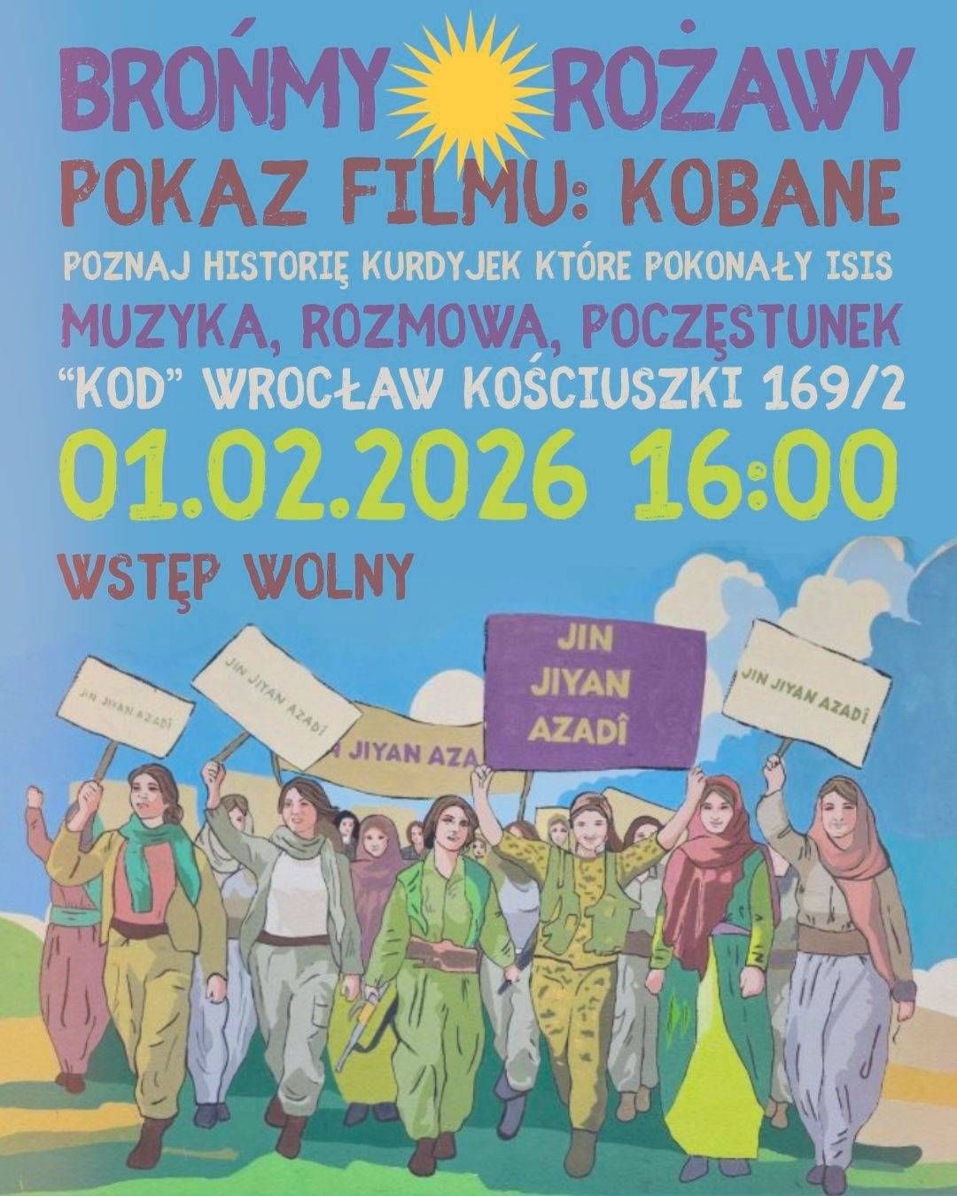 To spotkanie jest zaproszeniem do wspólnego poznania historii rewolucji Rożawy i kobiet, które odegrały kluczową rolę w pokonaniu ISIS, a dziś ponownie stają w obronie swoich społeczności. Podczas wydarzenia pokażemy film Kobanê, porozmawiamy o sytuacji Kurdów i Kurdyjek dziś, tego jak możemy pomóc w obronie Rożawy, będzie też muzyka i wspólny poczęstunek. Zapraszamy, bo wierzymy, że solidarność zaczyna się od wiedzy, rozmowy i bycia razem – zwłaszcza wtedy, gdy feministyczna i demokratyczna rewolucja znów jest zagrożona.