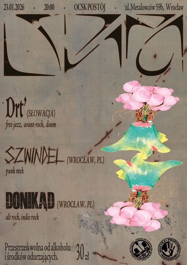 Musical start of the New Year in Postoj, already 4th times together, we start with the great Slovak feminist math rock free jazz - DRT. In addition, the local "donikąd" and "szwindel", the new Wrocław's bands that is growing faster than inflation, come and see because they are about to leave the underground in a moment, and there is no better basement than our living room, at least it seems to us.